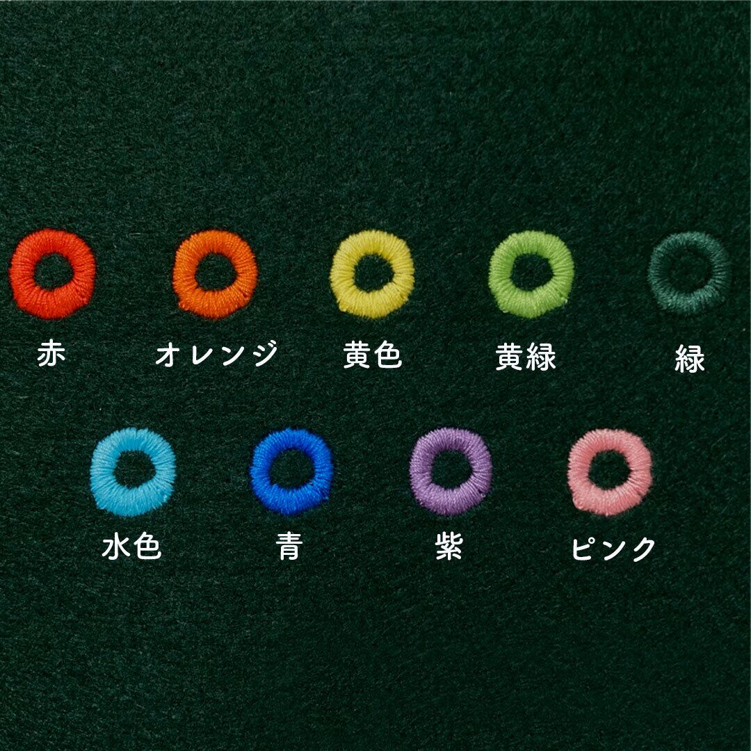 刺繍糸の色は全部で9色です。なお、選択いただく色は刺繍部分(名前など・裏面デザイン・縁)全て同じ色になります。