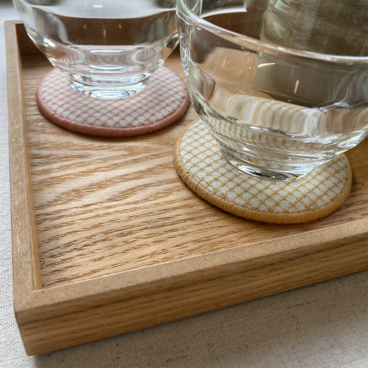 コップやグラスの水滴が机に垂れるのを防いでくれる機能的なコースター。全体的に落ち着いた色味の糸で刺繡しているため場所・人を選ばず使いやすいコースターに仕上げました。また、厚みがあり一般的なコースターに比べてしっかりしているのも特徴です。